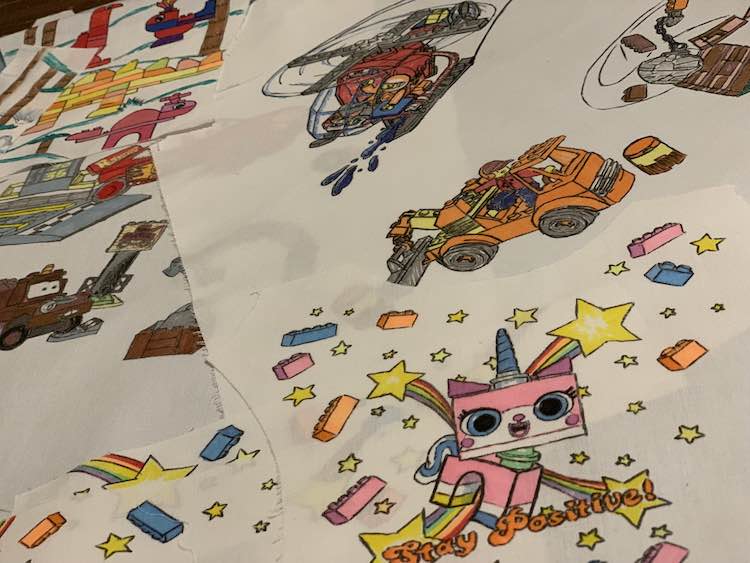 The Olivia top was a simple decision to sew up. I had sewn it up for both girls twice before and they loved it both times. I previously sewed theirs shirts with quilting cotton but the pattern is also designed for lightweight knit so I wasn’t concerned about using my brick fabric. Since I was personalizing the front of the shirt I only cut the knit fabric for the sleeves and back. Zoey loved all the vehicles on the coloring pages I printed out so her shirt ended up being rescue and construction vehicle scene so she could have all the vehicles she loved. Ada preferred the LEGO® Cars when she colored so I restricted her top to just the Cars characters. The Olivia top isn’t lined and I was worried about the transparency of the white fabric so I ended up lining the front with a blue fabric I had on hand. This stiffened the front of the shirt a bit so next time I might leave it unlined or using a thinner fabric so it drapes better.