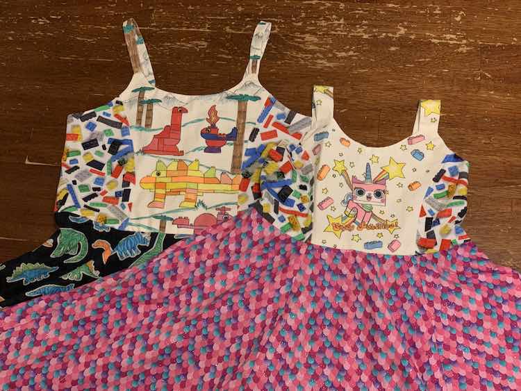 Back when I made the girls their Patsy Party Dress, for their Christmas presents, I cut one too many front and back skirt panels for either kid. I didn’t want to waste the cut panels so I decided to have the same skirt and change out the bodice to make it more LEGO® themed. The Patsy dress called for only woven fabric, but I wanted to use the knit brick fabric I bought. I consulted the Rebecca Page Facebook sewing group to see if anyone else switched out parts of their dress for knit fabric and decided to use the brick fabric for both the back and side panels on the bodice since the woven liner would, hopefully, stop the knit from stretching too much. I now needed to tie the brick fabric design with the skirt fabric (sparkly scales for Zoey and dinosaurs for Ada). This was solved by giving Zoey the Unikitty™design (sparkly scales seemed to match the design’s rainbows and stars) and making Ada’s have the DUPLO® dinosaurs since the skirt is already dinosaurs. And off I went.