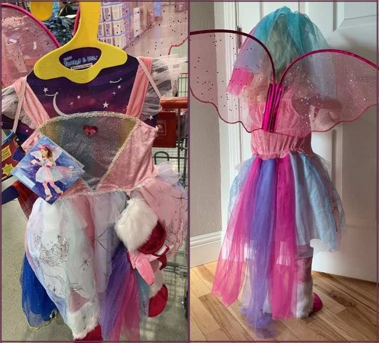 This story then gets even simpler as before I ordered fabric or started working on anything I ended up finding the perfect costume at Costco; about two weeks ago. The one time I was super excited that the Halloween stuff coming in early. I ended up agonizing, off to the side, about which size I should get and even brought up the sizing guide on the Rubie’s Costume Company website before I finally made myself choose. When I got home Ada was ecstatic and I, as I wasn’t sure how best to launder it and I didn’t want to wreck it before her party, then put the costume into a one week quarantine just in case. Ada finally got to try it on a couple days before her party and I was pleasantly surprised to discover that it also contained more accessories than I had realized making it even better.