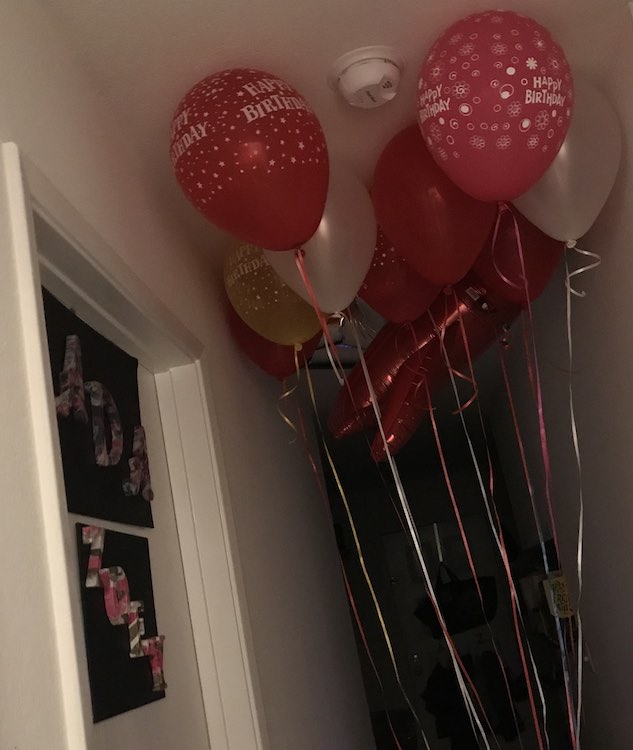 For the last several birthdays the kids have woken up with balloons grouped in front of their bedroom door to great them the morning of their birthday party. After they’ve had a chance to walk through the balloons and drag them along on the way to the kitchen table for breakfast I gather up a couple groups of two or three balloons to tie to our balcony railing for during the party while leaving the rest free for play.