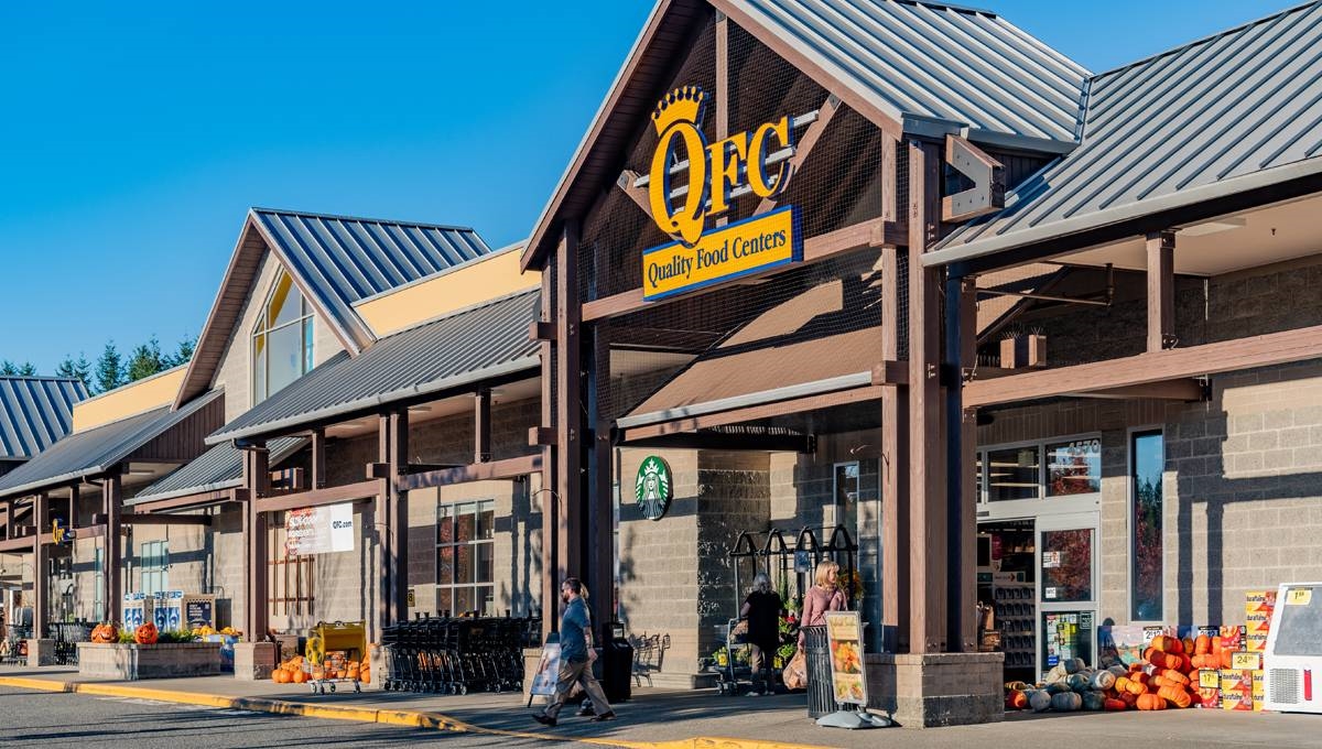 From the front door of Aya, you’ll spot QFC angled across the parking lot. If you walk past the storefront toward the near corner there’s a cozy outdoor seating area tucked between the buildings. Keep going and you’ll reach a set of stairs that lead to a nearby walking trail or, for a gentler route, you can follow the gravel road around QFC instead.,