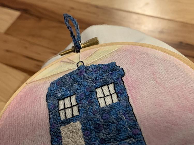 Before creating the loop to hang the embroidery with I first took some of the extra white embroidery floss from the kit to highlight the rays coming out from the TARDIS’s light. I then worked on the loop by taking three strands of embroidery floss (two of the color changing threads and one of the solid blue threads) and finger crocheted a more decorative and stronger string together. I then knotted it in a loop, took apart the embroidery hoop, and strung the loop on the post before doing the hoop back up.