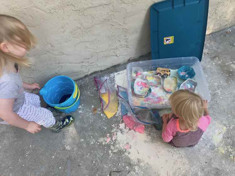 During the party some of the vinegar mixture from our explosions station made it’s way over but the oobleck was still easy to use. I noticed that even sitting in the sun for several hours the un-frozen oobleck cubes still kept their shape in the opened freezer bags. Ada had a blast playing during Zoey’s naptime and later both girls came back out for more fun before we cleaned it up.