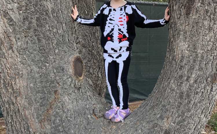 I combined knit fabric, our favorite clothing patterns, and an educational skeleton printable to create this costume! My biggest regret is the pelvis on the shirt and pants didn't fully overlap!