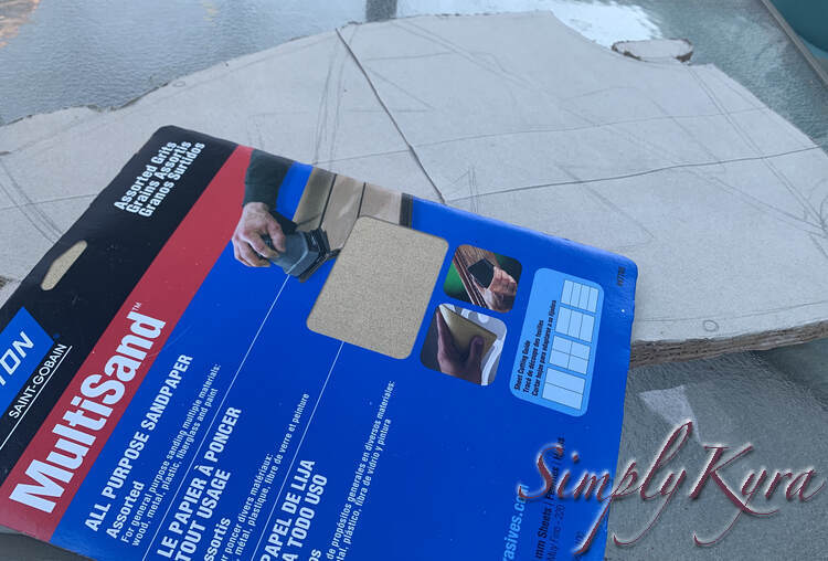 After cutting this, and the birds I was also attempting to make, I could feel my hands shaking as it remembered the vibrations of the knife. As such I decided, once I moved the knife, skateboard, and birds inside and cleaned up the cardboard, to save the rest for later. Once I was ready to continue I grabbed some sandpaper and smoothed out the ragged edges and the overlapping cereal boxes on top.