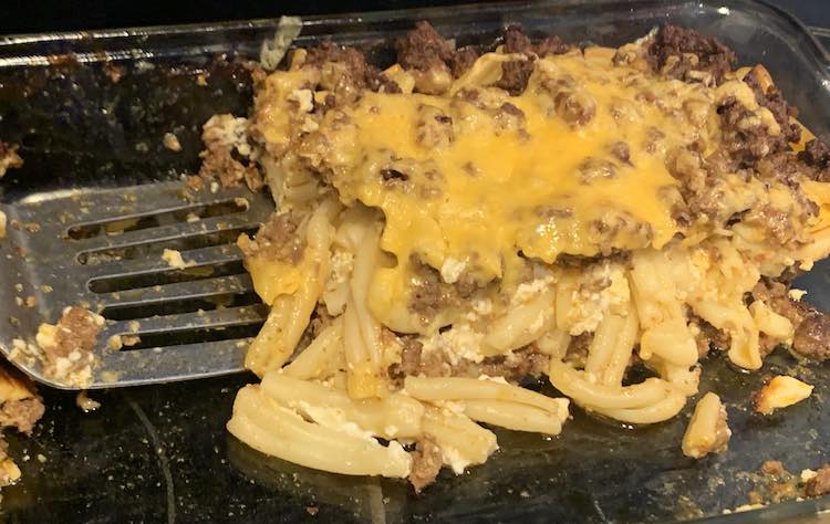 To create the casserole, after we finish supper, I quickly mix up the cheese layer by combining cottage cheese, grated cheddar cheese, and a couple of eggs. I then grab my glass casserole dish and start adding layers. Rather than greasing my dish I instead start by laying the taco meat at the bottom of the dish. I then follow that with a layer of pasta, then the mixed cheese, some more pasta, and then finally some more taco meat. I’ve had trouble in the past with my cheese sticking to the tinfoil top when baking in the oven so I’ve started leaving the top of the casserole plain and then later after it’s heated in the oven I can sprinkle some more cheddar cheese on top. If freezing this casserole, which I almost always do, I first wrap the top with tinfoil, add a label so I know what’s in it, and then use plastic wrap to keep it better protected for the freezer.