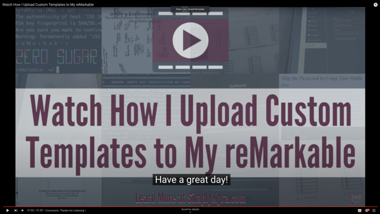Since buying my reMarkable, almost a year ago, and figuring out how to connect to my device, change out my sleep screen image, upload custom templates, writing my own script to make the entire process simpler (part one and two), and handling reMarkable updates… I’ve been meaning to make a video showing the process. I figured no time was like the present and created this hoping it would help make the entire process simpler for you. Hope this helps you upload, and maintain, your own custom templates!