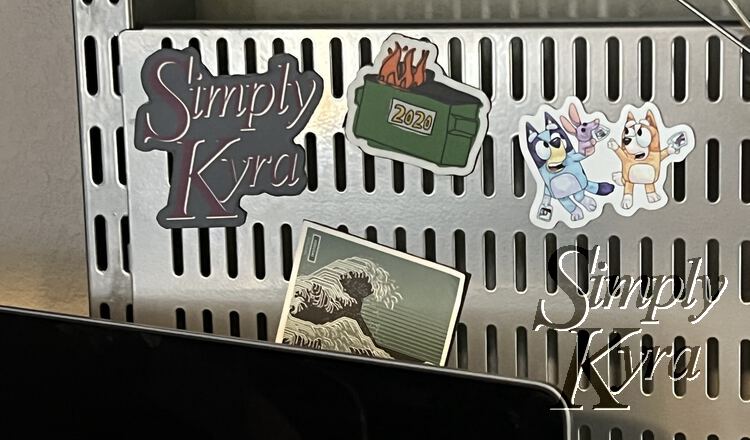 Sometime during or after this process Matt found a website, Make Stickers, that allows you to order custom stickers. He ordered a pile of SimplyKyra ones as a surprise for me. When they arrived I quickly put two on my laptop and one on the base of my computer monitor. I also wanted to make one of the stickers more permanent so I followed this process again turning one of the SimplyKyra stickers into a magnet. I loved having the SimplyKyra sticker on the pinboard next to the other three magnets!