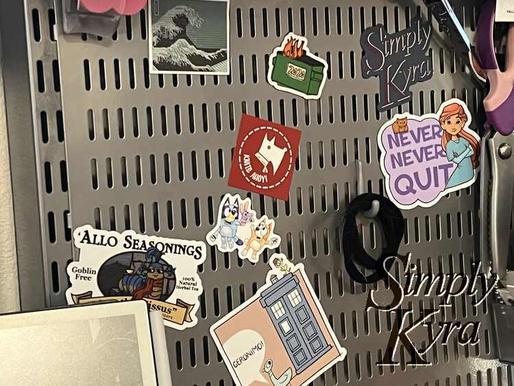 I had recently received a surprise Bluey-inspired magnet with my custom fabric order from Sweet Tickles Prints. At first I was slightly disappointed to realize it was a magnet as I had pictured it next to my other stickers on my computer monitor. Then Matt reminded me that I had a metal pegboard, bought from the Container Store, behind my computer and I stuck it there instead. I absolutely loved it there as I knew it would just get lost and ignored on the refrigerator door. Anyway, I wanted to share this quick magnet story with you as seeing it now made me wonder if I could turn my stickers into magnets. I knew I had a roll of skinny adhesive magnet tape and, once found, I also discovered an unopened package of 4 by 6 inch adhesive magnetic sheets I bought to attach to photographs. I realized this would work perfectly so I grabbed a sheet, removed the backing, and stuck the slightly less sticky stickers next to each other on the back of the magnet sheet.