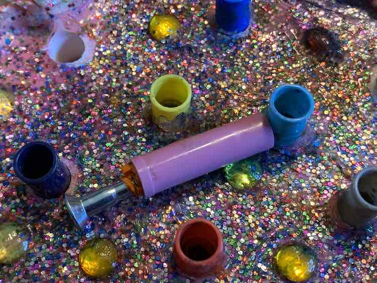And if you’re refilling the felt pen holder then you’re left with all of the marker lids. Zoey had been rescuing emptied toilet paper rolls from the garbage bins so I grabbed some of them and, along with the lids, set up a temporary sensory bin for her.