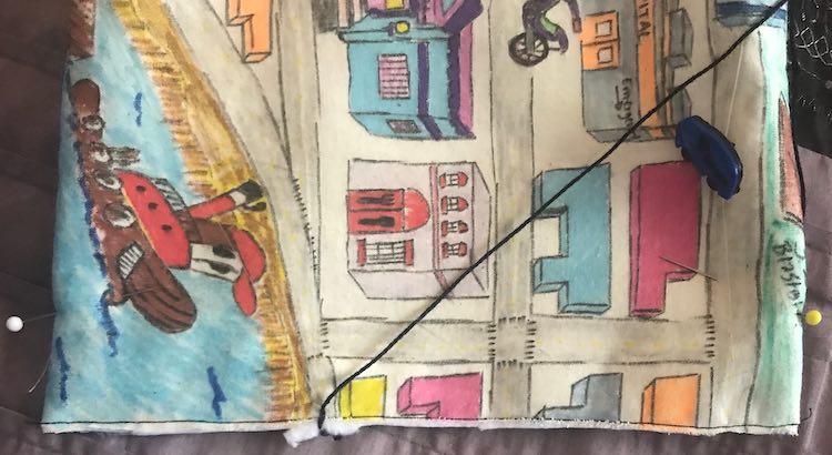 I wanted to create a quiet book page for the girls that encouraged open-ended pretend play. After thinking about it I decided to use my decorative buttons and attach them to the page in such a way that the girls could move them around and yet not lose them. I wanted to keep it fun and pretty so I decided to draw onto the base page an overhead map of roads and buildings so the buttons had somewhere to go. Since I wanted this page to revitalize the books I decided to bring some of their favorite characters into the book for them. To do this I decided to focus on two shows, Chuggington and Stinky & Dirty, and instead of mixing the characters up I chose to use Chuggington for Zoey’s page and Stinky & Dirty on Ada’s. I started by going online to find the main characters and, using GIMP, created printable pages showing the characters at different sizes. After cutting out the white fabric for the quiet book pages, you can read more about creating the quiet book base page here, I traced out my favorite characters onto them. Once I had the characters down I worked around them to add roads, buildings, and any other details I could think of to fill in the blank spaces. At this point all the drawings were outlines with my black fine-tipped fabric marker. I didn’t attempt to add too many details flush against the edges of the page but I did try not to leave blank spaces as I’d rather something be cut off in the seam allowance of the page than have a blank space showing afterwards. Once I was happy with the level of detail I used my iron to press the fabric and set the ink.